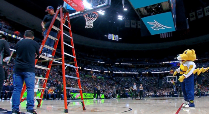 末节6分43秒,工作人员修理篮筐,拿着梯子、水平仪以及工具箱等等,多名工作人员抓紧时间校正篮筐,修了很久也没修好篮筐,工作人员满脸通红,之后工作人员拿来新的篮筐,换了一个新的篮筐,篮筐歪了导致比赛被迫延迟将近40分钟,这篮筐可能是罗威扣篮时拽坏的。