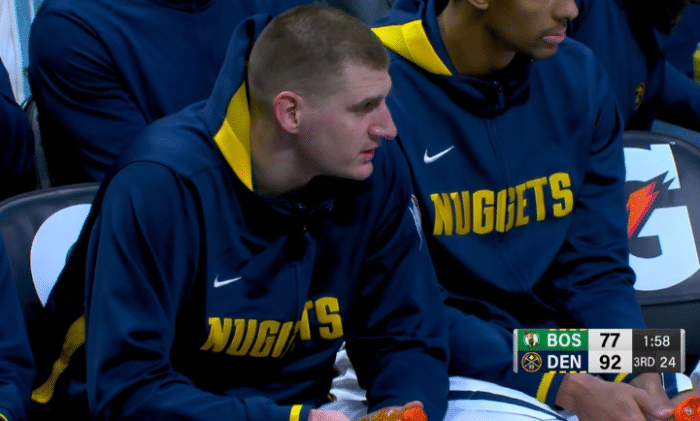 第四节,掘金接连命中4记三分,其中海兰德打疯了,连中3记三分助掘金保持领先,期间海兰德和杰伦-布朗发生口角险引冲突;6分43秒工作人员校正篮筐,好像是被罗威扣篮时拽歪了,篮筐歪了导致比赛中断超过30分钟,没修好最终更换新的篮筐,期间约基奇折返跑保持状态;比赛继续,约基奇继续得分以及保护篮板,拿到30+三双,最终带队稳稳拿下比赛。