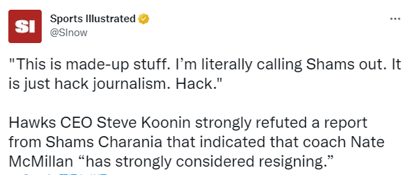 JRS直播网12月31日讯 ,名记shams爆料,亚特兰大老鹰主教练麦克米兰正在强烈考虑辞职,对于这样的辞职流言,老鹰主帅正式回应,目标带领老鹰冲击季后赛,赛季结束后考虑退役。