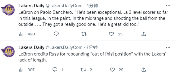 詹姆斯还盛赞魔术状元班凯罗:他非常出色,到目前为止他是联盟的全能得分手,他在内线、中距离和外线都能得分。他们(魔术)真的得到了一个很棒的球员。他也是一个好孩子。