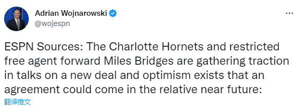 JRS直播网12月24日讯 ,据ESPN名记沃纳罗斯基报道,夏洛特黄蜂队正在和受限制自由球员布里奇斯谈判新的续约合同,乐观估计这份合同很快就能达成;签约后,NBA将对他进行停赛处罚,换言之,布里奇斯重返赛场前将被联盟禁赛。