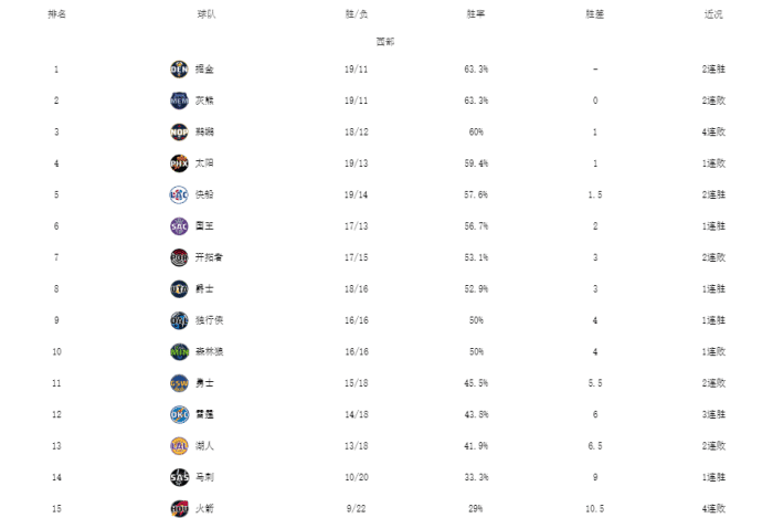 西部第一的球队又换了,掘金在击败灰熊之后,战绩来到19胜11负,和灰熊一样,凭借胜负关系升至西部第一。本赛季西部第一多次易主、勇士、太阳、开拓者和鹈鹕等队都登上过西部第一的位置。