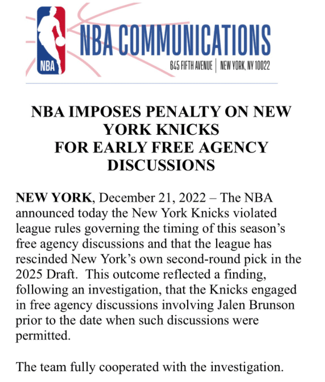JRS直播网12月22日讯 ,NBA官方正式宣布,纽约尼克斯因违规招募布伦森被剥夺一个2025年的次轮签,联盟官方声明,经调查,尼克斯在允许开始签约谈判日期前就已经开始与布伦森进行接触,因此违规。