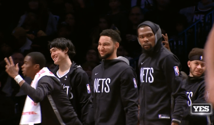 第二节,篮网继续把勇士按在地板上摩擦,当篮网完成配合,西蒙斯空接双手暴扣,杜兰特站起来做出戴眼镜庆祝的动作,因进场庆祝吃到技术犯规;杜兰特重新上场后再次挥舞镰刀, 不断砍分,急停干拔招牌中投稳准狠,上半场最后时刻,杜兰特失去节奏仍轰进不讲理三分,此时KD拍了一下格林的屁股,欧文则站在场边笑开了花。