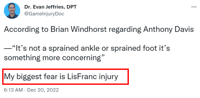 JRS直播网12月20日讯 了,据名记文霍斯特透露,浓眉的右脚或者右脚踝并非扭伤,这是更令人担心的地方。医学专家Jeffries很快转发并点评:“我最担心的是他遭遇了跖跗关节伤病。”