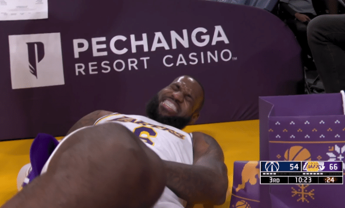 下半场,詹姆斯继续带队,强硬突破造阿夫迪亚犯规,老詹重摔倒地时大腿被撞了一下,当时詹姆斯痛得嗷嗷叫,所幸只是硬伤,老詹两罚一中;奇才不断缩小分差,詹姆斯胯下传球并助攻托马斯-布莱恩特炸裂暴扣,不过湖人的领先优势越来越小,并且被反超,期间里夫斯90度崴脚,离场返回更衣室。