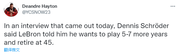 再过两个多星期,詹姆斯就要年满38周岁了,近日施罗德谈到詹姆斯何时退役的话题,施罗德表示:我问过他还想再打多久的篮球,实际上他说他还想再打5到7年。现在他是38岁,他说他想打到45岁为止。