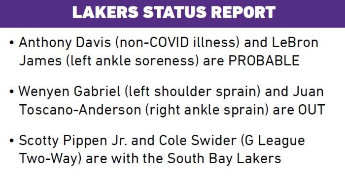 JRS直播网12月09日,湖人官方公布下一场对阵费城76人的伤情报告,詹姆斯(左脚踝酸痛)和浓眉(非新冠生病)大概率出战,75%可能性上场;加布里埃尔(左肩扭伤)和托斯卡诺-安德森(右脚踝扭伤)因伤缺席比赛,小皮蓬和斯威德跟随南湾湖人,仍旧留在发展联盟。