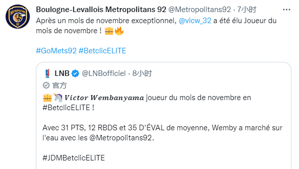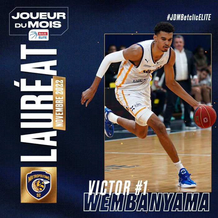 JRS直播网12月09日,LNB官方公布月最佳球员,巴黎大都会92队球员文班亚马当选11月份法甲篮球联赛月最佳球员,马刺球迷希望球队能够得到他。