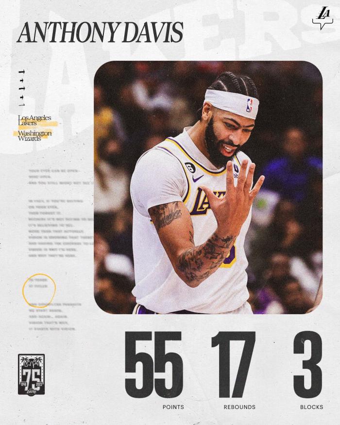 浓眉狂砍55分17篮板3盖帽,一战狂刷多项历史纪录,疯狂表现引众人狂赞。
