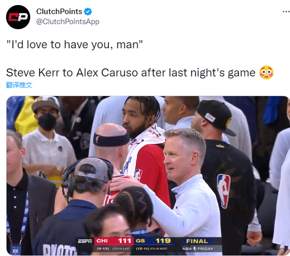 JRS直播网12月04日,勇士主帅科尔招募卡鲁索一幕曝光,在勇士击败公牛赛后,科尔搂着卡鲁索进行了一番亲切交流,期间科尔表示:我很想把你招过来,伙计。