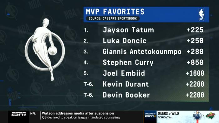 JRS直播网12月02日,NBA本赛季最新MVP赔率出炉,塔图姆领跑全联盟,东契奇和字母哥分列第二和第三,库里第四,杜兰特与布克并列第六。