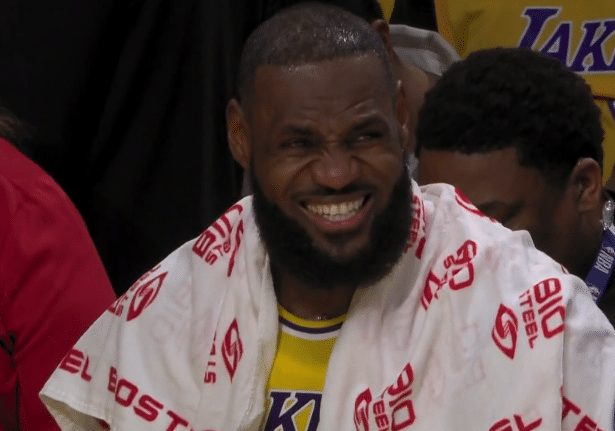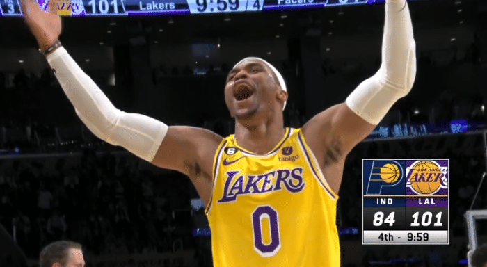 下半场,詹姆斯第三节仅仅投进一记三分,老詹休息时,浓眉和威少带队打出一波疯狂的进攻,浓眉保护篮板,威少、纳恩、小布朗都轰进三分,三节打完湖人领先9分,期间威少打开心了,金鸡独立后仰跳投,威少做出经典的哄娃娃庆祝动作,威少还疯狂跳舞庆祝点燃球馆。