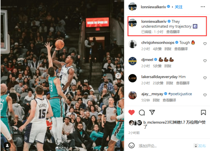 JRS直播网11月28日,湖人球员朗尼-沃克更新社交媒体,在Ins上晒出多张对阵旧主马刺的赛场照,并且配文写道:他们低估了我的发展轨迹。沃克还透露詹姆斯39分11篮板大爆发的真因,湖人记者猜测是兰福德激怒了老詹。