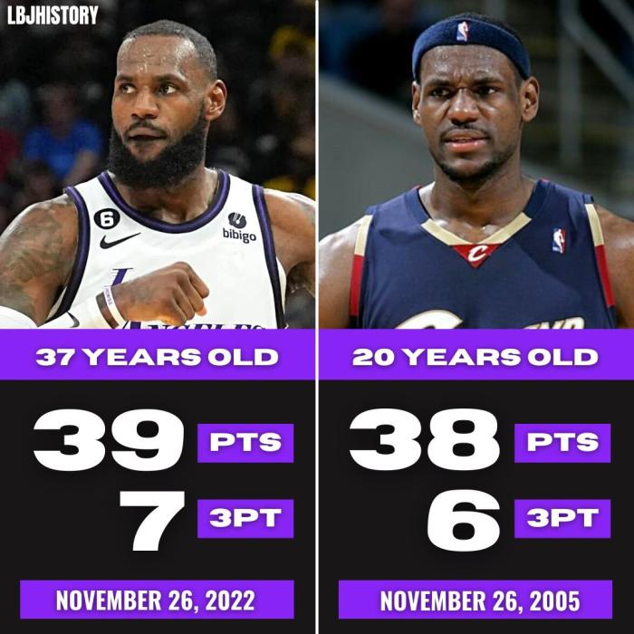 37岁詹姆斯打出赛季最佳一战,39分和7记三分都是赛季新高,37岁332天成为NBA历史单场砍下至少35分10篮板7记三分的年纪最大的球员。同时,老詹也是保持这项纪录年纪最小的球员。