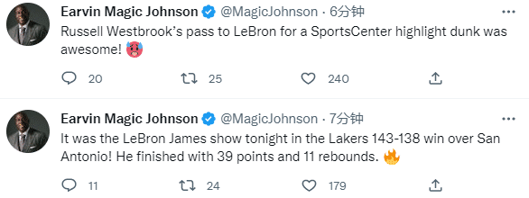 湖人名宿魔术师约翰逊发推:湖人143-138战胜马刺,今晚就是属于詹姆斯的表演!他砍下了39分11篮板;詹姆斯和威少的空接连线太棒了。