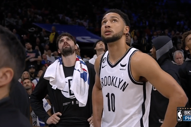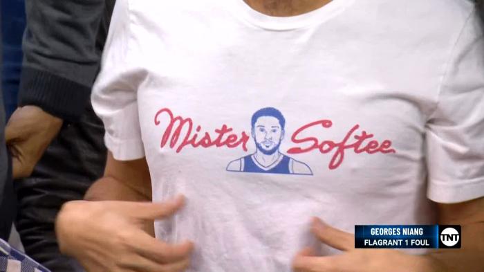 第二节,尼昂在防守时肘击西蒙斯的腹部,本西痛苦地跑到场边,裁判回放之后吹罚尼昂一级恶意犯规;西蒙斯两罚一中,尼昂仍旧不满判罚,之后西蒙斯和前队友激烈互喷,杜兰特站在一旁看热闹。