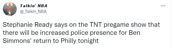 西蒙斯重返费城引关注,据TNT记者Stephanie Ready现场报道,为应对任何突发事件,费城主场球馆内外均增加警力,他们将确保万无一失。