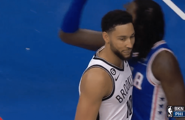 比赛正式开打,西蒙斯一拿球就遭狂嘘,造犯规执行罚球时,现场满天嘘声,本西顶住压力,并且两罚全中,之后西蒙斯做出摊手耸肩的回应动作;值得一提的是,据现场记者报道,在罚中第一球后,欧文做出了“Shutup”的手势,示意现场观众闭嘴。