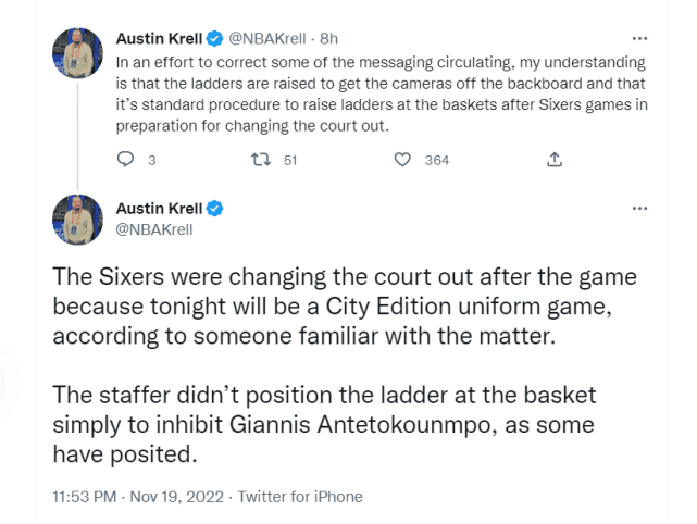 76人前方记者报道称,费城工作人员并不是想干扰字母哥,而是费城的下一场比赛要穿城市版球衣,他们需要拆下篮筐上方的设备,然后抓紧时间更换地板,但字母哥并不知情,所以双方发生了争执。