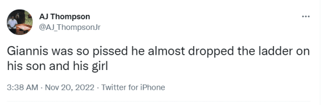 字母哥赛后解释:“我回到那里投篮,我面前有一个梯子, 我说,‘你能把梯子移开吗?他们说,‘不行。’”我说,'你们能把梯子移开吗?他们说,'不。我当时想,'伙计们,我还有两次罚球机会,你们能把梯子移开吗?他们说,‘不。’我把梯子推开,它卡住倒下了,就是这样。”