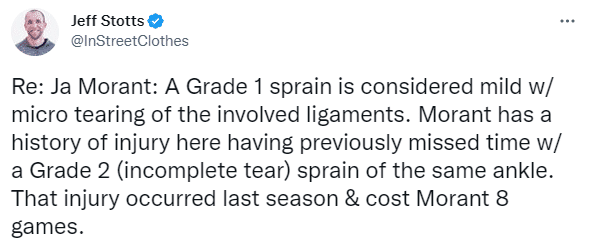 医学专家Jeff Stotts发推写道:莫兰特左脚踝一级拉伤被认为是轻微的,韧带有轻微撕裂;莫兰特有这样的伤病史,上赛季因左脚踝二级扭伤缺席了8场比赛。