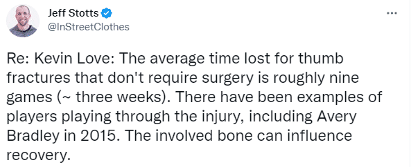 Jeff Stotts表示拇指骨折不需要手术,平均休战三周缺席9场比赛,有球员带伤出战的案例,2015年布拉德利曾这样做,这会影响伤势的恢复。