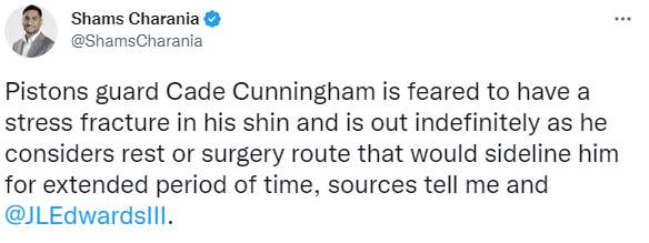 据名记shams报道,活塞状元坎宁安恐遭应力性骨折,目前他正在考虑是否接受手术,无限期休战。