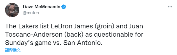 10、湖人宣布下一场对阵马刺的伤情报告,詹姆斯因腹股沟伤势被列为出战成疑,老詹已经因伤连续缺席3场比赛,安德森(背伤)也是出战成疑。