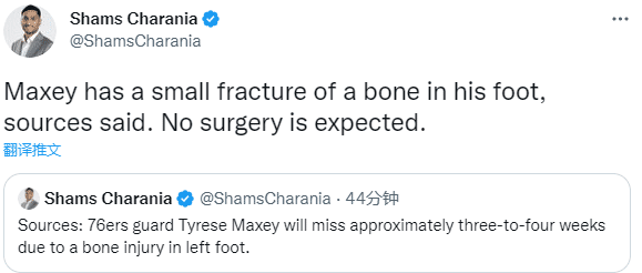 马克西的核磁检查结果出炉,伤情确诊为左脚轻微骨折,预计不需要手术,将因伤缺席3-4周。