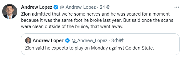 锡安亲自宣布,他预计将在下周对阵勇士的比赛中复出;锡安表示:截止到目前,我可以说我肯定会在下周二对阵勇士的比赛中复出。我找不到不那么做的理由,我已经有了足够的休息时间,现在疼痛感似乎也已经消失了;受伤的那一刻我有些害怕,伙计,我真的不想再经历一次了。好在除了瘀伤外,扫描检查结果都是阴性的。