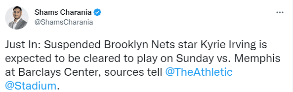 JRS直播网11月17日,欧文复出时间来了,据名记shams报道,欧文预计将获准在下周一对阵灰熊的比赛中复出,名记沃纳罗斯基此前也报道过类似的消息;shams还曝篮网和联盟都对欧文所做的一切很满意,欧文超额完成了归队要求;杜兰特坦言非常想念欧文。
