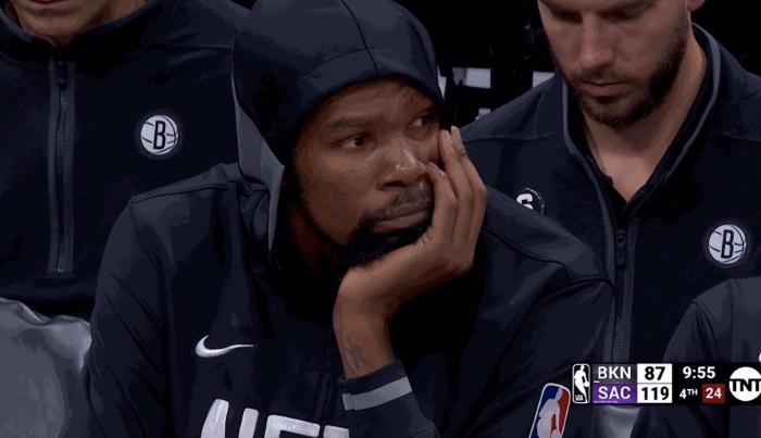 最后一节,枯坐板凳的杜兰特显得非常沮丧。他单手托腮眼神迷离,不知道在想些什么。全场比赛,杜兰特15中8得到27分6助攻4篮板。但队友给他的支持太少,首发球员仅有萨姆纳得分上双。如果不是在第四节垃圾时间连续追分,可能这场比赛的分差会非常难看。