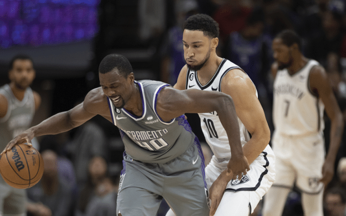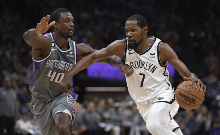 首节比赛,杜兰特连续两次中投以及杀到禁区打成2+1,可篮网防守太糟糕,国王轻松得分并且24-11早早领先两位数,之后杜兰特带队追分,单节独砍12分,篮网第一节落后6分;第二节篮网追到40平后突然全队哑火,戴维斯助国王打出24-2的超级攻势,杜兰特继续得分,可半场打完篮网54-73落后19分。