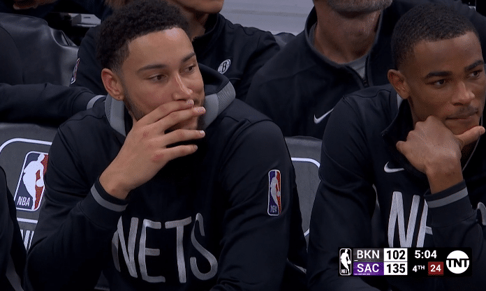 末节比赛早早沦为垃圾时间,杜兰特坐在替补席不再上场,提前一节放弃比赛;镜头给到篮网替补席,杜兰特托着腮一脸沮丧的表情;不过西蒙斯仍旧露出笑容,笑着与克拉克斯顿聊天,本场比赛,西蒙斯替补上场20分钟,7投5中拿到11分5篮板3助攻。