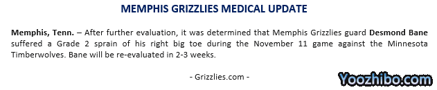 JRS直播网11月16日,孟菲斯灰熊遭重击,灰熊官方宣布,球队后卫贝恩的伤情经诊断确诊为右大脚趾二级扭伤,他将在2-3周后重新接受评估;换言之,灰熊二当家至少伤停2-3周。