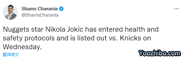 JRS直播网11月16日,掘金遭遇突发事件,据名记shams报道,约基奇触发联盟的健康与安全协议,将会缺席周四与尼克斯的比赛。