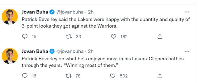 湖人在揭幕战上外线表现糟糕,三分40投10中。谈到湖人的三分出手数量和质量,贝弗利表示球队对此感到开心,但毫无疑问,三分投射的空位是出来了,他们就是命中太少了。谈到近年洛城德比最享受什么,贝弗利的回应是“赢下其中绝大多数的对决。”