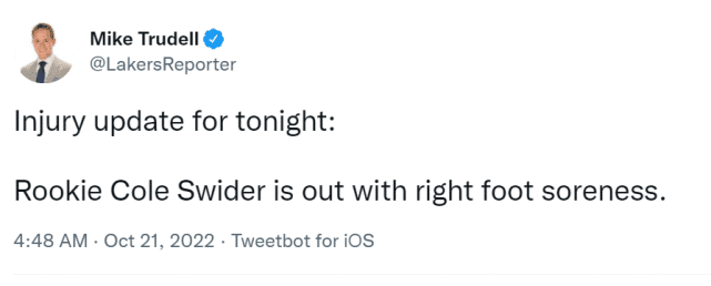 JRS直播网10月21日,湖人官方宣布,科尔-斯威德因右脚酸痛将缺席今日的洛城德比。常规赛刚刚开始,湖人的伤病潮已经袭来,目前在伤病名单上的球员,已经增至6人。