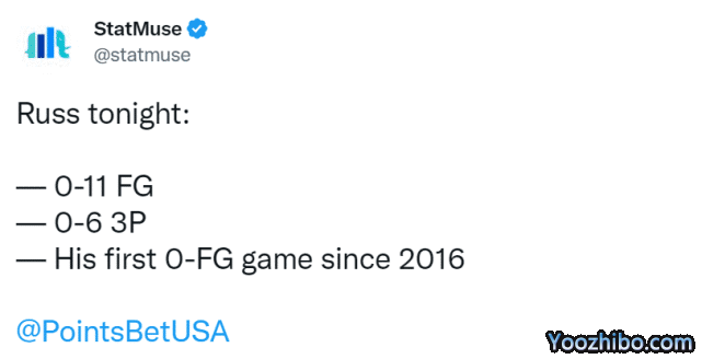 JRS直播网10月21日,湖人97-103不敌快船,再次输掉洛城德比。威少出战27分钟,投篮11中0,三分6中0,罚球2中2,拿到2分3篮板4助攻5抢断1失误,最后1分4秒被弃用。