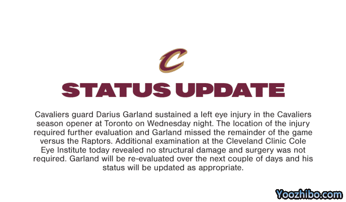 JRS直播网10月21日,克利夫兰骑士官方更新加兰的伤情,经过进一步的检查,加兰的眼伤没有结构性损伤,也不需要接受手术,他将在未来几天重新接受评估;据骑士记者报道,加兰眼睛肿胀无法睁开,眼球布满血丝,预计他将因伤休战几天。