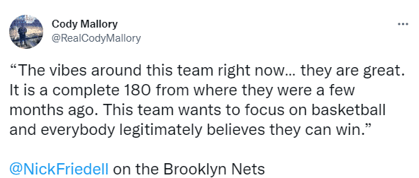 JRS直播网10月20日,今夏篮网双巨杜兰特和欧文都曾请求离队,闹了整整一个夏天,尤其是杜兰特的离队闹剧,最终杜欧都决定留守篮网并且继续带队冲击总冠军;名记曝目前篮网队内氛围很好,shams更爆料欧文花钱请全队一起聚餐。
