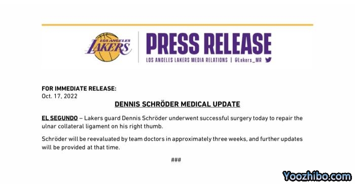 JRS直播网10月18日,湖人官方宣布揭幕战伤情报告,詹姆斯(左脚酸痛)、浓眉(背部酸痛)和威少(腿筋酸痛)大概率出战,施罗德、托马斯-布莱恩特和特洛伊-布朗都因伤缺席比赛,其中施罗德成功接受右手拇指尺侧副韧带撕裂修复手术,预计至少伤停三周。