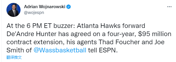JRS直播网10月18日,据ESPN名记沃纳罗斯基报道,德安德烈-亨特的经纪人透露,亨特已经同意与老鹰达成4年9500万美元的提前续约合同,未来5年继续联手特雷-杨冲击总冠军。