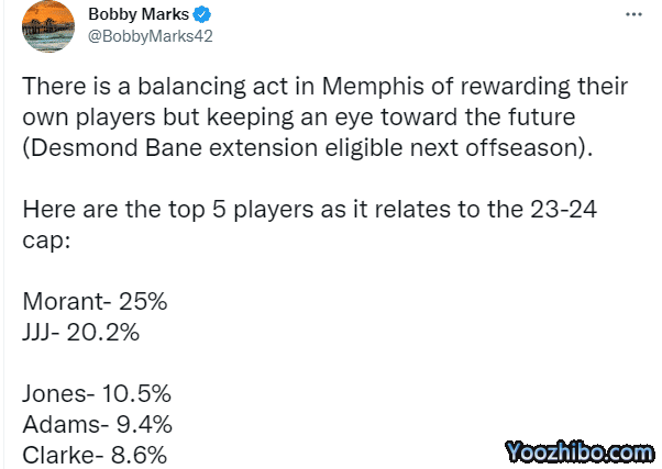 薪资专家Bobby Marks分析灰熊队续约的5名球员下赛季的薪资占比,莫兰特和小杰克逊占比超4成,发推写道:灰熊队的操作很平衡,既奖励自己的年轻球员,又关注未来(贝恩下休赛期有资格续约)。
