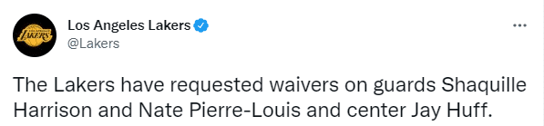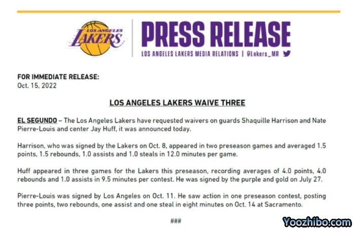 湖人官方宣布,球队正式裁掉后卫沙奎尔-哈里森、后卫内特-皮埃尔-路易斯和中锋杰-胡夫,今年休赛期,他们三人都和湖人签下Exhibit10训练营合同。