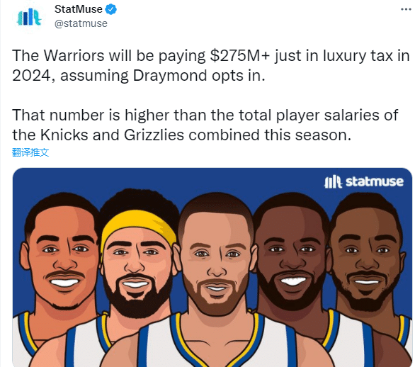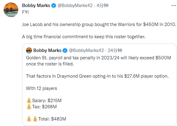 据薪资专家Bobby Marks分析,若格林选择执行23-24赛季2760万的球员选项的话, 勇士12名球员23-24赛季薪资总额将达到2.15亿,奢侈税将达到2.68亿,总计4.83亿,一旦满员,薪资与奢侈税总额很可能会超过5亿美元。