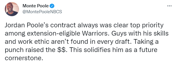 22-23赛季,普尔年薪仅仅只有390万美元,下赛季普尔的薪水将暴涨至3500万美元左右;勇士记者Monte Poole发推写道:勇士优先续约普尔,后者是一位有能力且有职业道德的球员,挨拳后获得大合同,这巩固了他作为未来基石的地位。