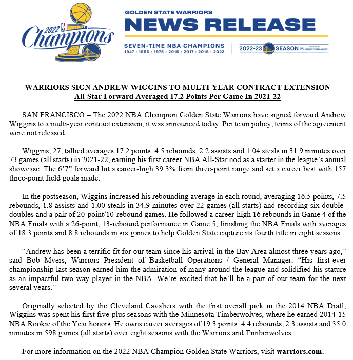 对于维金斯续约,勇士总经理鲍勃-迈尔斯发表声明:自从三年前来到旧金山以来,维金斯就与我们的球队非常适配,他在上赛季赢得了生涯第一个NBA总冠军,获得了联盟内外的一致赞誉,并巩固了他作为NBA中有影响力的攻防一体的球员地位,我们很高兴他能在接下来的几年里成为我们球队的一员。