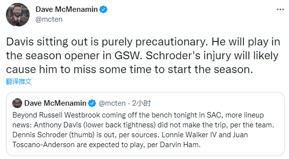 JRS直播网10月15日,湖人在最后一场季前赛之前再次变阵,浓眉(背部酸痛)和施罗德(拇指受伤)因伤缺战国王,湖人安排威少替补出战,这可能是威少新赛季改打替补的前兆,湖人记者更是直言他认为揭幕战威少不会首发的。